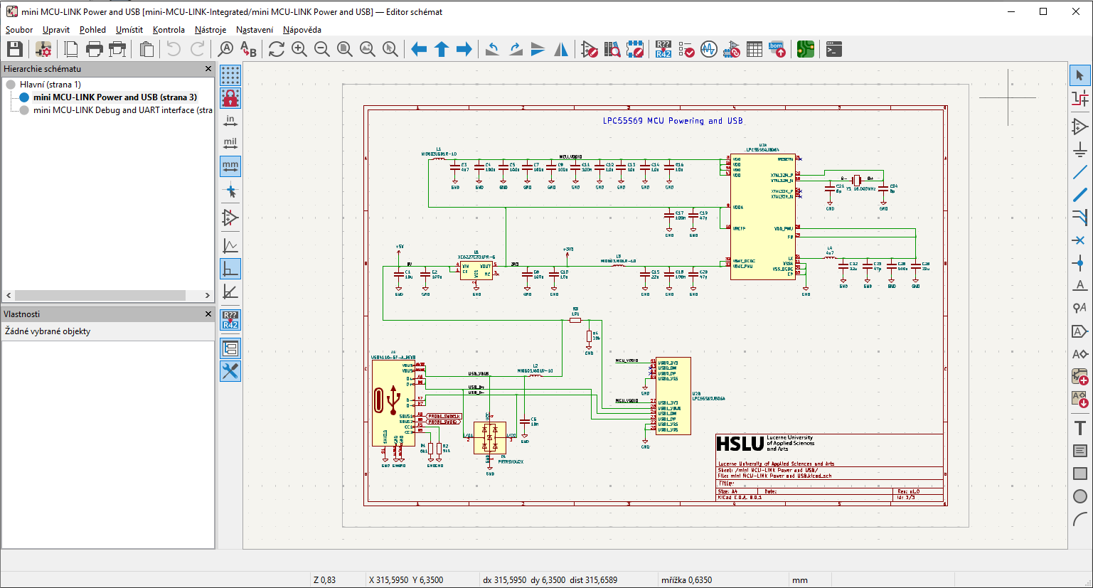 KiCad provides a capable open-source schematic editor that balances usability with advanced functionality. The Eeschema module in KiCad offers hierarchical design support, ERC checking, and an extensive component library that is continuously updated by the community. Unlike Altium, KiCad does not have a built-in cloud collaboration system, but it allows version control via external Git integration. While the interface may not be as polished as commercial counterparts, it remains an efficient and highly flexible tool, particularly for small-to-medium projects and users who prefer open-source solutions. Furthermore, KiCad supports SPICE simulation through integration with external simulation tools, allowing users to verify circuit behavior before PCB layout. An example of how the schematic editor GUI looks like in KiCAD environment is shown in the following Figure.