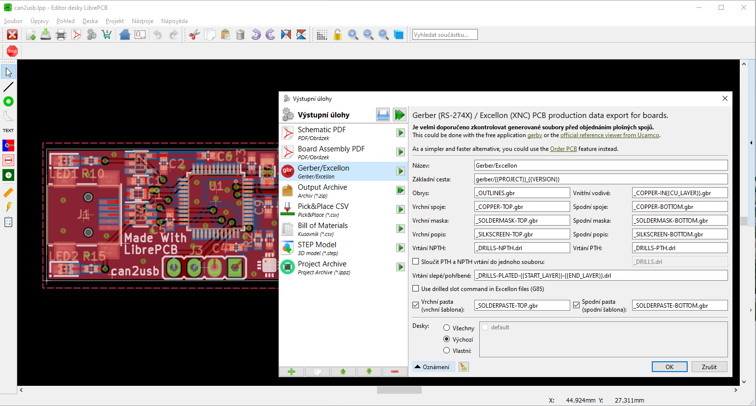 LibrePCB simplifies the process of generating fabrication outputs with an easy-to-use CAM export system. It supports essential formats such as Gerber, Excellon drill files, and BOM, ensuring compatibility with standard PCB manufacturing workflows. While LibrePCB does not yet support advanced fabrication output formats like ODB++ or IPC-2581, it covers the fundamental requirements for most small-scale PCB projects. The tool includes basic DRC checks, but it lacks advanced DFM verification or built-in Gerber viewers, meaning designers may need external tools to verify fabrication files before submission. Despite these limitations, LibrePCB offers a streamlined approach that suits hobbyists and small-scale projects where simplicity is preferred over complex fabrication requirements. An approach to the generation of various output data types in LibrePCB tool is shown on in the following Figure.